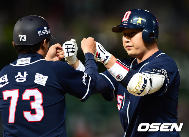 7회초 2사 만루에서 두산 양의지가 우전 2타점 적시타를 치고 전상렬 코치와 하이파이브를 하고 있다.