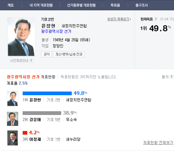 4일 전국에서 진행된 전국동시지방선거의 개표가 계속되고 있다. 광주시장 선거에서는 새정치민주연합 윤장현 후보가 무소속 강운태 후보에 앞서고 있다.