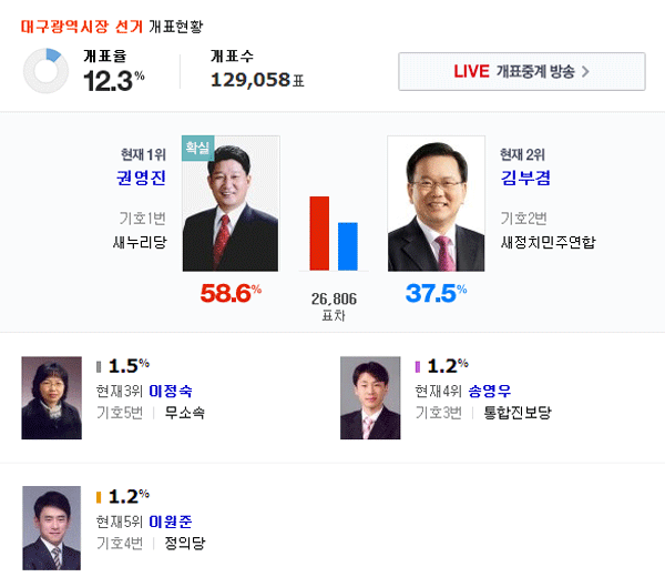 12.3% 개표가 진행된 가운데 권영진 후보는 58.6%의 득표율로 37.5% 득표한 김부겸 후보에 크게 앞서고 있다. 출구조사에서도 권영진 후보는 김부겸 후보를 크게 앞서 당선이 유력한 상황이었다.
