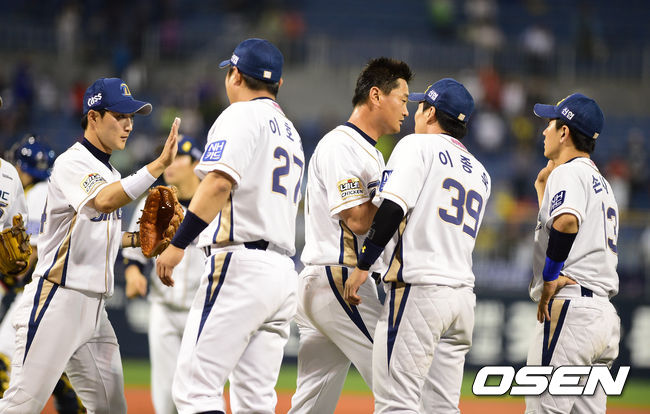 1425일 만에 1군 복귀전을 갖는 NC 박명환이 9회초 마운드에 올라 무실점으로 막으며 동료선수들과 승리 하이파이브를 하고 있다./jpnews@osen.co.kr
