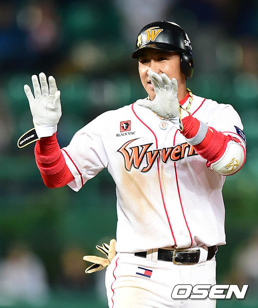 9회말 무사 만루에서 싹쓸이 적시 2루타를 친 SK 김강민이 동료들을 향해 손을 들고 있다./sunday@osen.co.kr