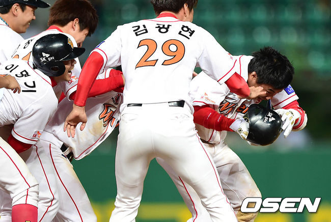 9회말 무사 만루에서 싹쓸이 적시 2루타를 친 SK 김강민이 동료들에게 축하를 받고 있다./sunday@osen.co.kr
