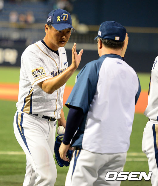 1425일 만에 1군 복귀전을 치른 NC 박명환이 경기후 김경문 감독과 승리 하이파이브를 하고 있다. /jpnews@osen.co.kr