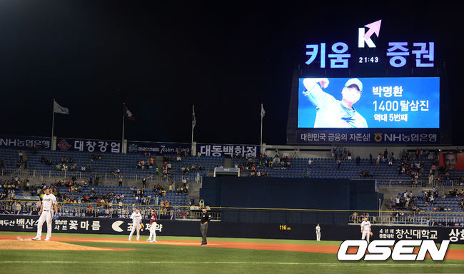 1425일 만에 1군 복귀전을 갖는 NC 박명환이 9회초 마운드에 올라 넥센 박헌도를 상대로 삼진을 잡으며 1,400 탈삼진을 기록하고 있다./jpnews@osen.co.kr