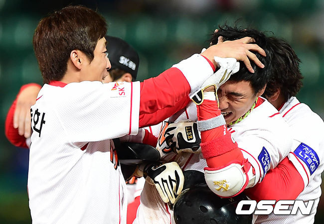 9회말 무사 만루에서 싹쓸이 3타점 적시 2루타를 친 SK 김강민이 동료들에게 축하를 받고 있다./sunday@osen.co.kr
