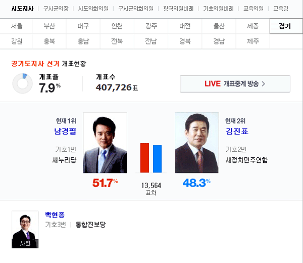 4일 전국에서 진행된 전국동시지방선거의 개표가 계속되고 있다. 경기도지사 선거에서는 새누리당 남경필 후보가 새정치민주연합 김진표 후보에 앞서고 있다.