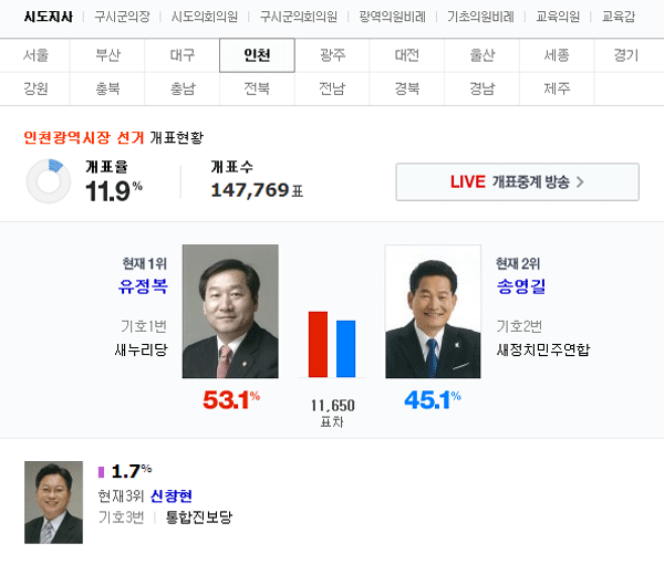 11.9% 개표가 진행된 가운데 유정복 후보는 53.1%의 득표율로 45.1% 득표한 송영길 후보에 꾸준히 앞서고 있다. 출구조사에서도 유정복 후보가 송영길 후보에 근소하게 앞섰다. 개표가 시작되자 유정복 후보는 줄곧 선두 자리를 내주지 않고 있다.