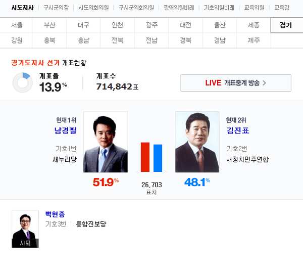 4일 전국에서 진행된 전국동시지방선거의 개표가 계속되고 있다. 경기도지사 선거에서는 새누리당 남경필 후보가 새정치민주연합 김진표 후보에 꾸준히 앞서고 있다.