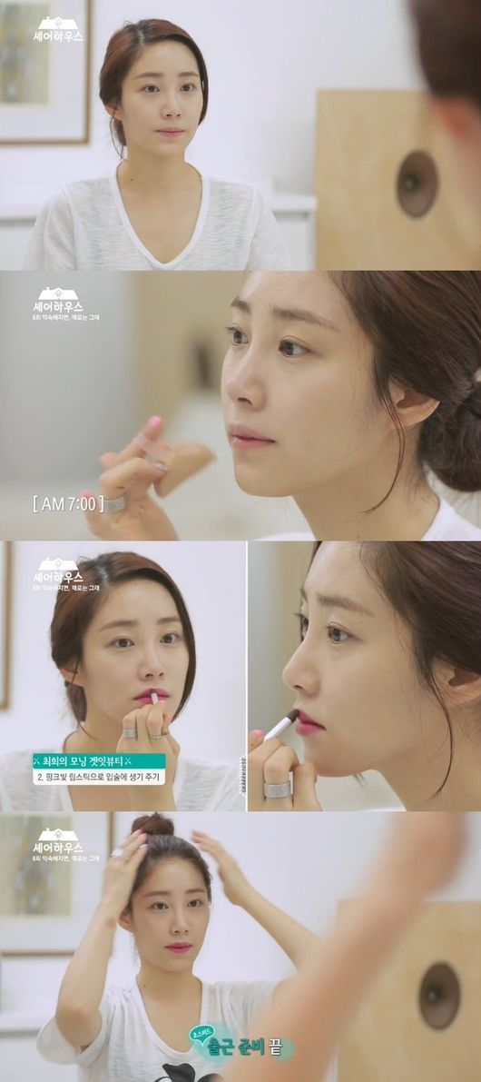 청순한 매력을 발산하며 화장을 시작한 최희는 비비크림과 핑크빛 립스틱만으로 출근준비를 완료했다.