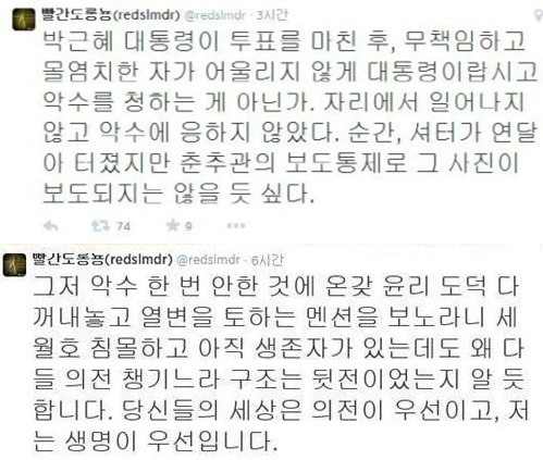 논란이 가시지 않자 김한울은 "그저 악수 한 번 안한 거에 온간 윤리 도덕 다 꺼내놓고 열변을 토하는 멘션을 보노라니 세월호 침몰하고 아직 생존자가 있는데도 왜 다들 의전 챙기느라 구조는 뒷전이었는지 알 듯 합니다"라며 다시 한 번 악수 거부에 대한 자신의 의사를 분명하게 밝혔다.