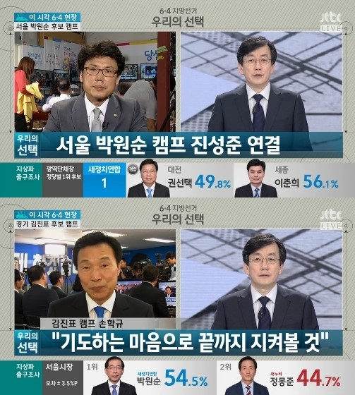 이날 JTBC는 비상 특보체제로 전환, 오전 1시까지 개표방송이 진행됐다. 특히 손석희 사장을 앞세워 시청자들로부터 좋은 반응을 얻었다.