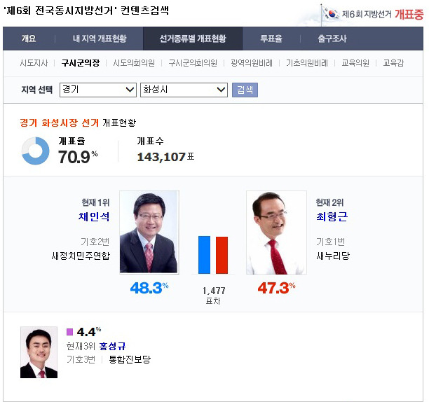 경기도 화성시장의 경우 개표율 70.9%를 기록한 가운데 새정치민주연합 채인석 후보가 48.3%의 지지를 얻어 새누리당 최형근 후보의 47.3%를 근소하게 앞서고 있다. 표차가 불과 1477표에 불과해 선거결과가 뒤집힐 가능성도 남아있다.