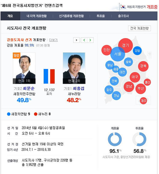 선거결과를 확인한 네티즌들은 “선거결과 박빙이네요”, “강원도지사 선거결과 흥미롭군”, “선거결과 나왔네요. 지역구 잘 이끌어주시길”, “선거결과 다들 수긍하고 수고해주세요” 등의 반응을 보였다.