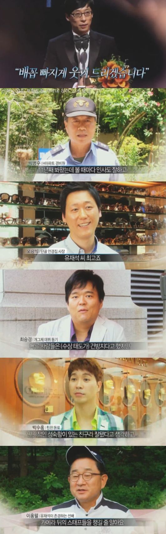 유재석이 거주하는 아파트의 경비 박명수 씨는 “내가 11년 째 유재석을 봐왔는데 볼 때마다 인사를 잘한다”고 말했고, 단골 안경점 직원은 “유재석은 최고다. 남의 말을 잘 들어주는 사람이다. 내가 추천한 것도 잘 쓴다”이라고 평했다.