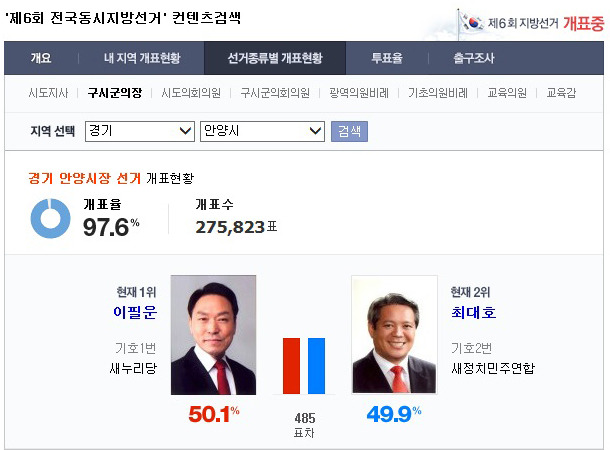 안양시장의 경우 선거결과가 더 치열하다. 새누리당 이필운 후보는 50.1%의 지지율을 얻어 49.9%를 얻은 새정치민주연합 최대호 후보를 앞서고 있다. 표차가 불과 485표에 불과하다. 개표율이 97.6%임에도 윤곽이 나오지 않고 있다. 더구나 개표과정에서 문제가 생겨 재개표가 이뤄지는 상황이라 결과를 더 알 수 없다.