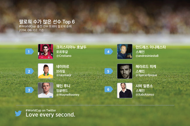 트위터 코리아는 5일 브라질 월드컵 참가 선수들 중 가장 많은 팔로워를 보유한 ‘브라질 월드컵 플레이어 톱(TOP) 6’를 5일 발표했다.