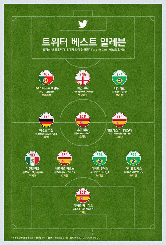 이번 발표는 미국 트위터 본사가 6월 13일에 개막하는 브라질 월드컵을 앞두고 실시한 조사를 토대로 진행됐다. 조사 결과에 따르면 브라질 월드컵에 참가하는 32개국 736명 선수들 중 약 300여명이 트위터 계정을 갖고 있었다.