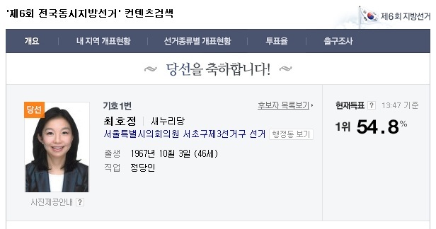 한편, 4일 열린 6.4 지방선거 개표결과 서초구 제3선거구 시의원에 출마한 새누리당 최호정 당선인은 54.8%의 지지를 얻어 42.6%에 그친 새정치민주연합 류은숙 후보를 제치고 재선에 성공했다.