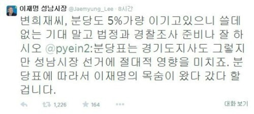 재선이 확실시 되자 이재명 성남시장 당선자는 이날 새벽 자신의 트위터에 "변희재씨, 분당도 5%가량 이기고 있으니 쓸데없는 기대 말고 법정과 경찰조사 준비나 잘 하시오"라고 적었다. 현재 이 멘션은 트위터에서 삭제된 상태다.
