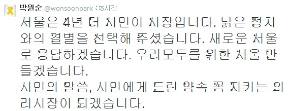 당선이 확실시 되자 5일 새벽 2시 8분 박 시장은 트위터를 통해 재선 성공 소감을 전했다. 박 시장은 "서울은 4년 더 시민이 시장입니다"라며 "낡은 정치와의 결별을 선택해 주셨습니다"라며 새로운 서울을 만들겠다고 다짐했다.