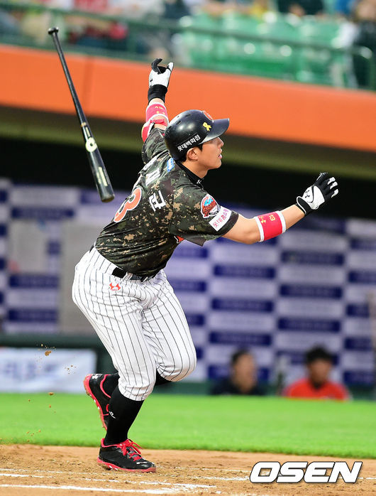 2회말 2사에서 롯데 황재균이 좌익수 플라이 타구를 날리고 타구를 바라보고 있다.