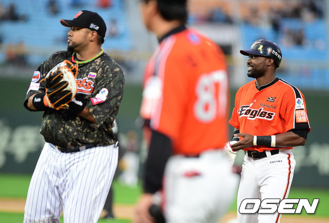 2회초 1사에서 한화 피에가 우전안타를 날리고 롯데 히메네스와 인사를 나누며 미소짓고 있다. 히메네스와 피에는 어제 경기가 비로 중단되자 더그아웃에서 서로의 모습을 따라하며 관중들을 즐겁게 했다.