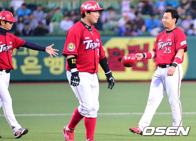 1회초 KIA 공격 2사 1, 3루 상황에서 선제 1타점 좌전 안타를 날린 이범호가 공수교대 때 김종국 코치에게 헬멧을 건네고 있다.