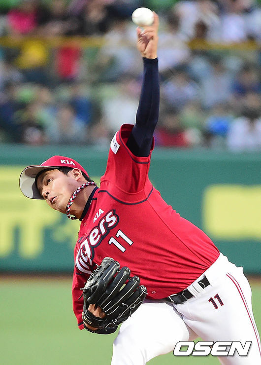 KIA 선발 임준섭이 힘차게 공을 뿌리고 있다.