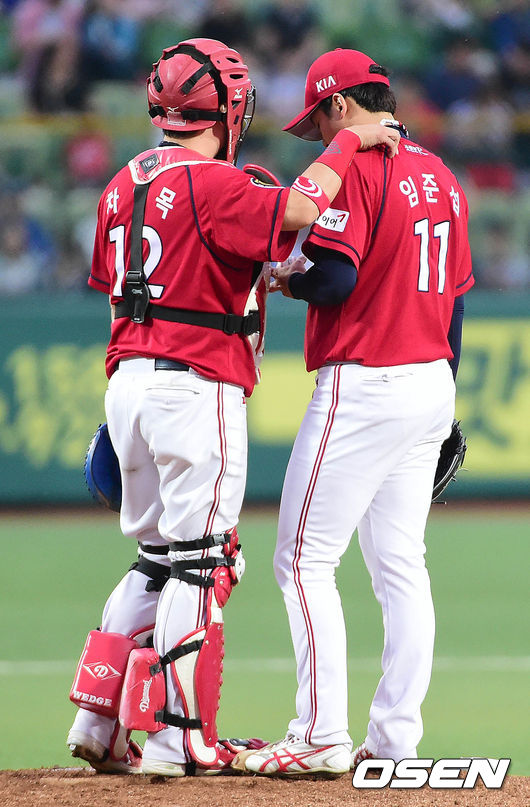 1회말 삼성 공격 무사 만루 상황 KIA 선발 임준섭과 포수 차일목이 마운드에서 대화를 나누고 있다.