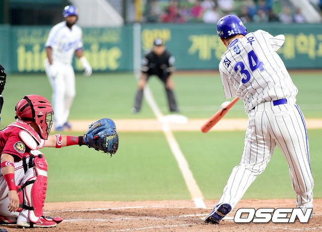 1회말 삼성 공격 무사 만루 상황 최형우가 1타점 좌익수 희생플라이를 날리고 있다.