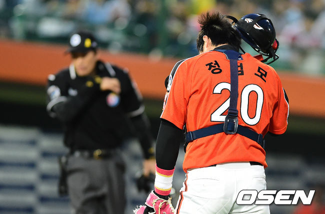 4회말 2사 3루에서 한화 정범모가 앨버스의 폭투로 실점하며 아쉬워하고 있다.
