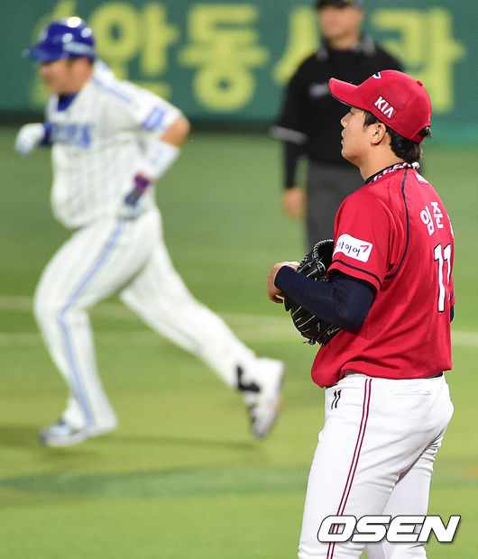 3회말 삼성 공격 선두타자로 나선 최형우에게 중월 솔로포를 허용한 KIA 투수 임준섭이 아쉬워하고 있다.