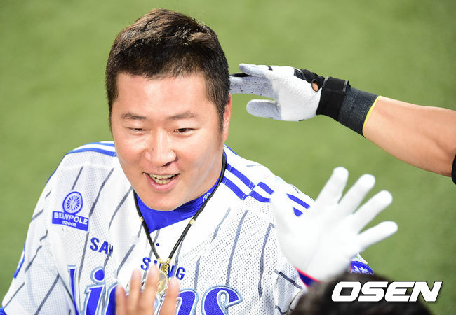3회말 삼성 공격 선두타자로 나선 최형우가 중월 솔로포를 날리고 홈을 밟은 뒤 더그아웃 동료들과 인사를 나누고 있다.