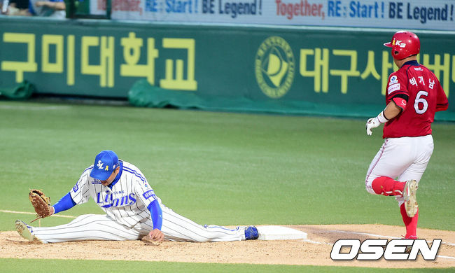 3회초 KIA 공격 2사 2, 3루 상황 박기남의 유격수 땅볼 때 삼성 1루수 채태인이 몸을 쭉 뻗어 송구를 잡아내고 있다.