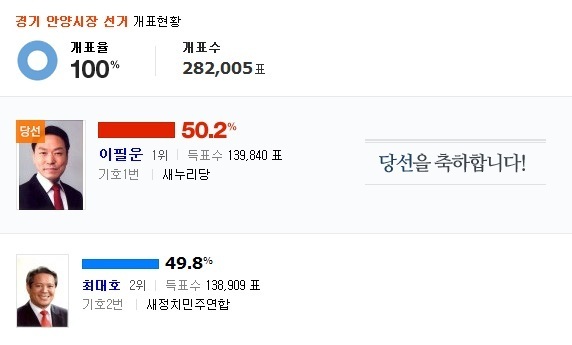 안양시장의 경우 새누리당 이필운 후보가 50.2%의 지지율을 얻어 최종 당선됐다. 개표과정에서 문제가 생겨 재개표가 이뤄져 후보들에게는 더욱 피말리는 순간이 지나가기도 했다.