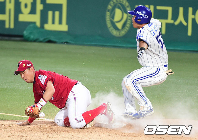 3회말 삼성 공격 무사 1, 2루 상황 김헌곤이 투수 앞 번트 안타를 대고 1루에 슬라이딩해 세이프되고 있다.