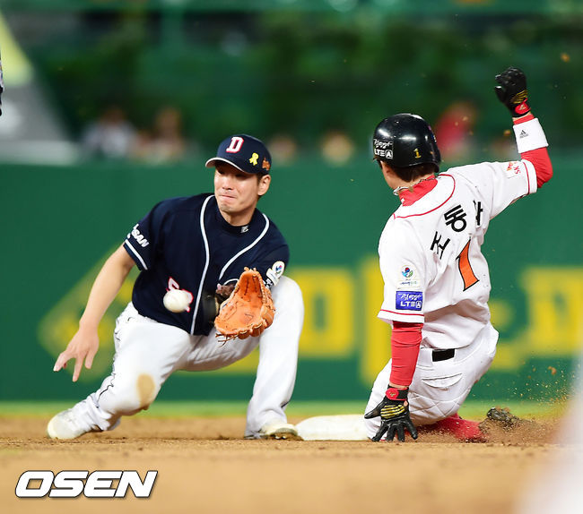5일 오후 인천 문학야구장에서 열린 2014 한국야쿠르트 세븐 프로야구 SK 와이번스와 두산베어스의 경기, 4회말 2사 주자 1루 SK 임훈 타석에서 1루 주자 조동화가 2루 도루에 실패하고 있다.