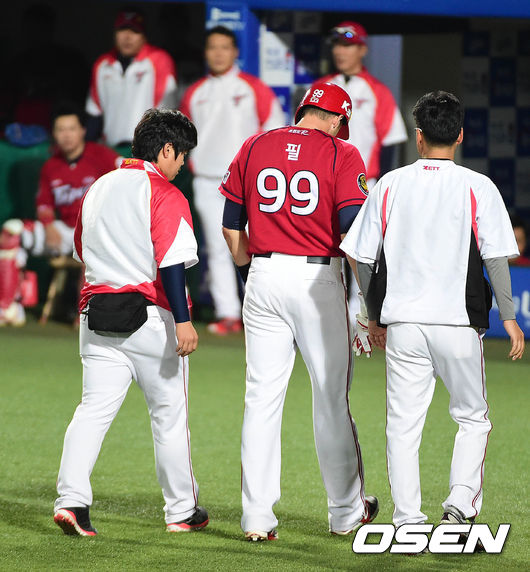 5회초 KIA 공격 1사 주자없는 상황 필이 삼성 선발 배영수의 공에 손가락을 맞은 뒤 대주자 김민우로 교체돼 그라운드를 나서고 있다.