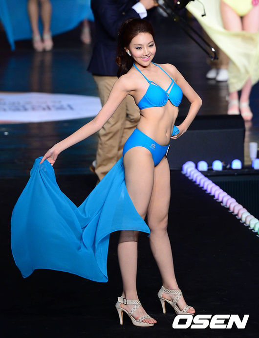 참가번호 10번 유정인이 수영복 퍼레이드에서 멋진 워킹을 선보이고 있다.