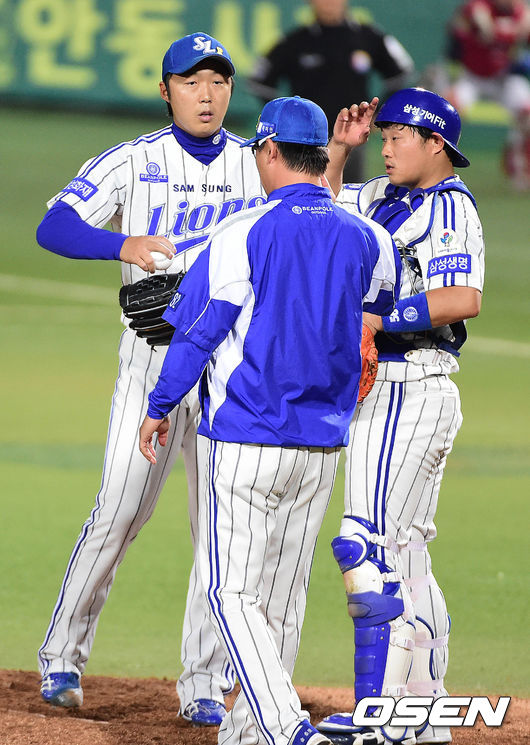 5회초 KIA 공격 1사 1, 2루 상황 삼성 선발 배영수가 포수 이지영, 김태한 코치와 대화를 나누고 있다.