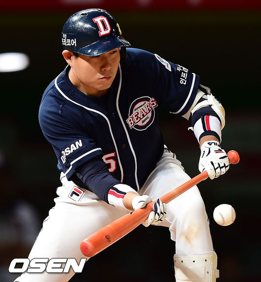 5일 오후 인천 문학야구장에서 열린 2014 한국야쿠르트 세븐 프로야구 SK 와이번스와 두산베어스의 경기, 5회초 무사 주자 1,2루 두산 양의지가 희생번트에 성공하고 있다.