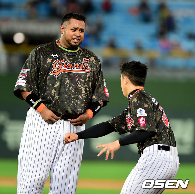 6회말 2사 2루에서 1타점 우전 적시타를 날린 롯데 손아섭이 6회 공격을 마치고 히메네스와 이야기를 나누며 즐거워하고 있다.