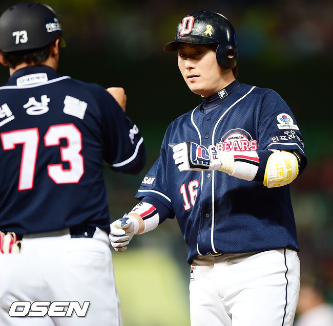 5일 오후 인천 문학야구장에서 열린 2014 한국야쿠르트 세븐 프로야구 SK 와이번스와 두산베어스의 경기, 5회초 1사 주자 2,3루 두산 이원석이 좌익수 앞 동점 1타점 적시타를 날린 후 1루에서 전상렬 코치와 하이파이브를 하고 있다.