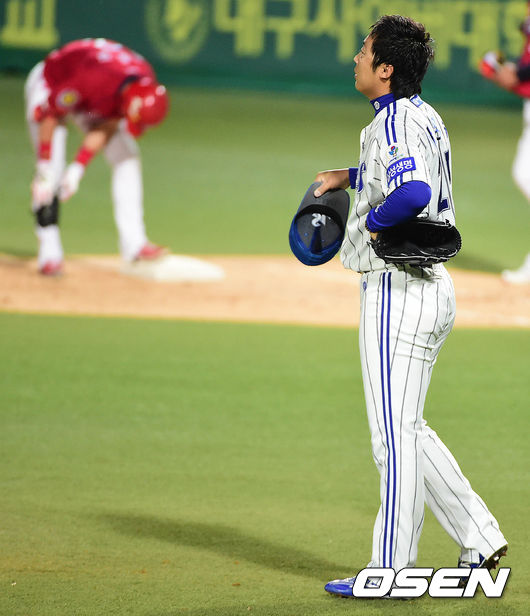 5회초 KIA 공격 1사 2, 3루 상황 신종길에게 추격의 1타점 중전안타를 허용한 삼성 투수 배영수가 아쉬워하고 있다.
