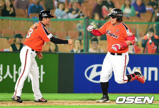 7회초 무사에서 한화 김태균이 솔로포를 날리고 그라운드를 돌며 이종범 코치와 하이파이브를 하고 있다.