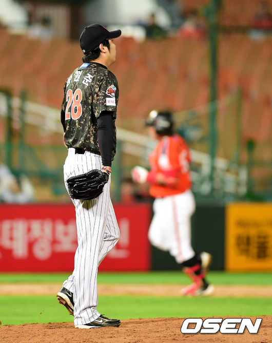 7회초 무사에서 롯데 장원준이 한화 김태균에 솔로포를 허용하며 아쉬워하고 있다.