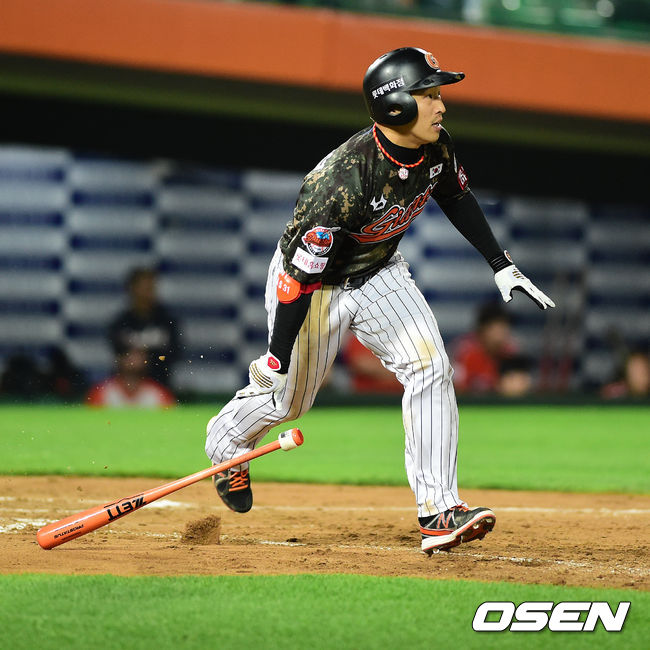 6회말 2사 2루에서 롯데 손아섭이 1타점 우전 적시타를 날리고 타구를 바라보고 있다.