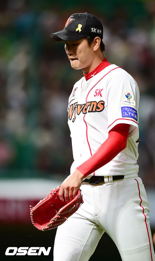5일 오후 인천 문학야구장에서 열린 2014 한국야쿠르트 세븐 프로야구 SK 와이번스와 두산베어스의 경기, 6회초 2사 주자 1루 SK 선발 김광현이 교체되고 있다.