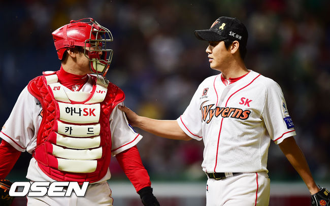 5일 오후 인천 문학야구장에서 열린 2014 한국야쿠르트 세븐 프로야구 SK 와이번스와 두산베어스의 경기, 6회초를 마무리한 SK 윤길현이 이재원을 격려하고 있다.