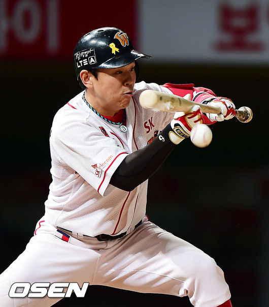 5일 오후 인천 문학야구장에서 열린 2014 한국야쿠르트 세븐 프로야구 SK 와이번스와 두산베어스의 경기, 6회말 무사 주자 1루 SK 나주환이 희생번트에 성공하고 있다.